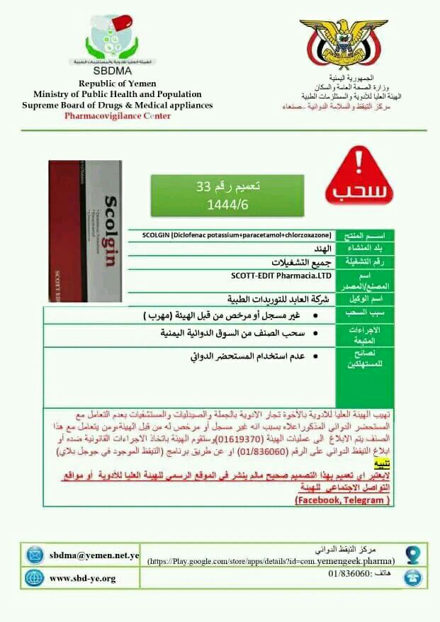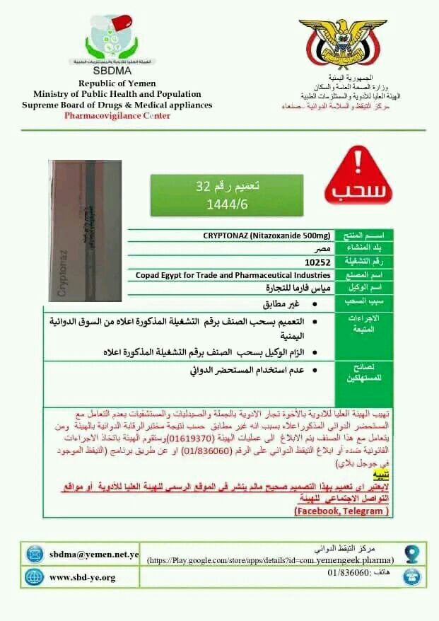 كما شملت تعميمات الهيئة المستحضر الصيدلاني المصري ( CRYPTONAZ ( Nitazoxanide 500mg ) الذي يتم استيراده بواسطة الوكيل “مياس فارما للتجارة”، وكذلك المستحضر الصيدلاني الهندي ( Diclofenac potassium + paracetamol + chlorzoxazone ) المستورد بواسطة الوكيل “شركة العابد للتوريدات الطبية”.
