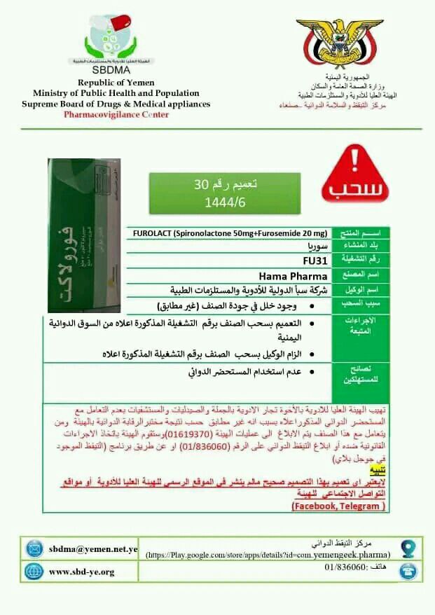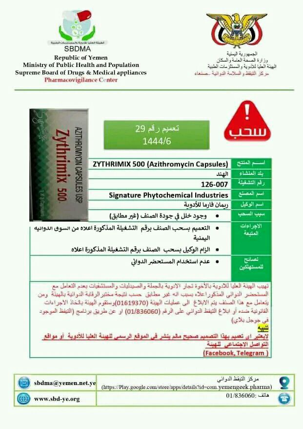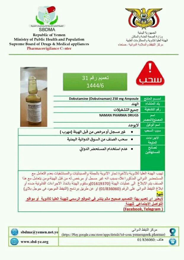 حيث وجهت الهيئة في صنعاء بسحب المستحضر الصيدلاني الهندي ( ZYTHRIMIX 500 ( Azithromycin Capsules )، الذي يتم استيراده عن طريق الوكيل “ريمان فارما”، وكذلك المستحضر الصيدلاني السوري AUROLACT) Spironolactone 50mg + Furosemide 20 mg ) الذي يتم استيراده بواسطة الوكيل “شركة سبأ الدولية للأدوية والمستلزمات الطبية”، إضافة للمستحضر الصيدلاني الهندي Dobutamine ( Dobutmaman ) 250 mg Ampoule ) الذي يدخل البلاد عن طريق التهريب.